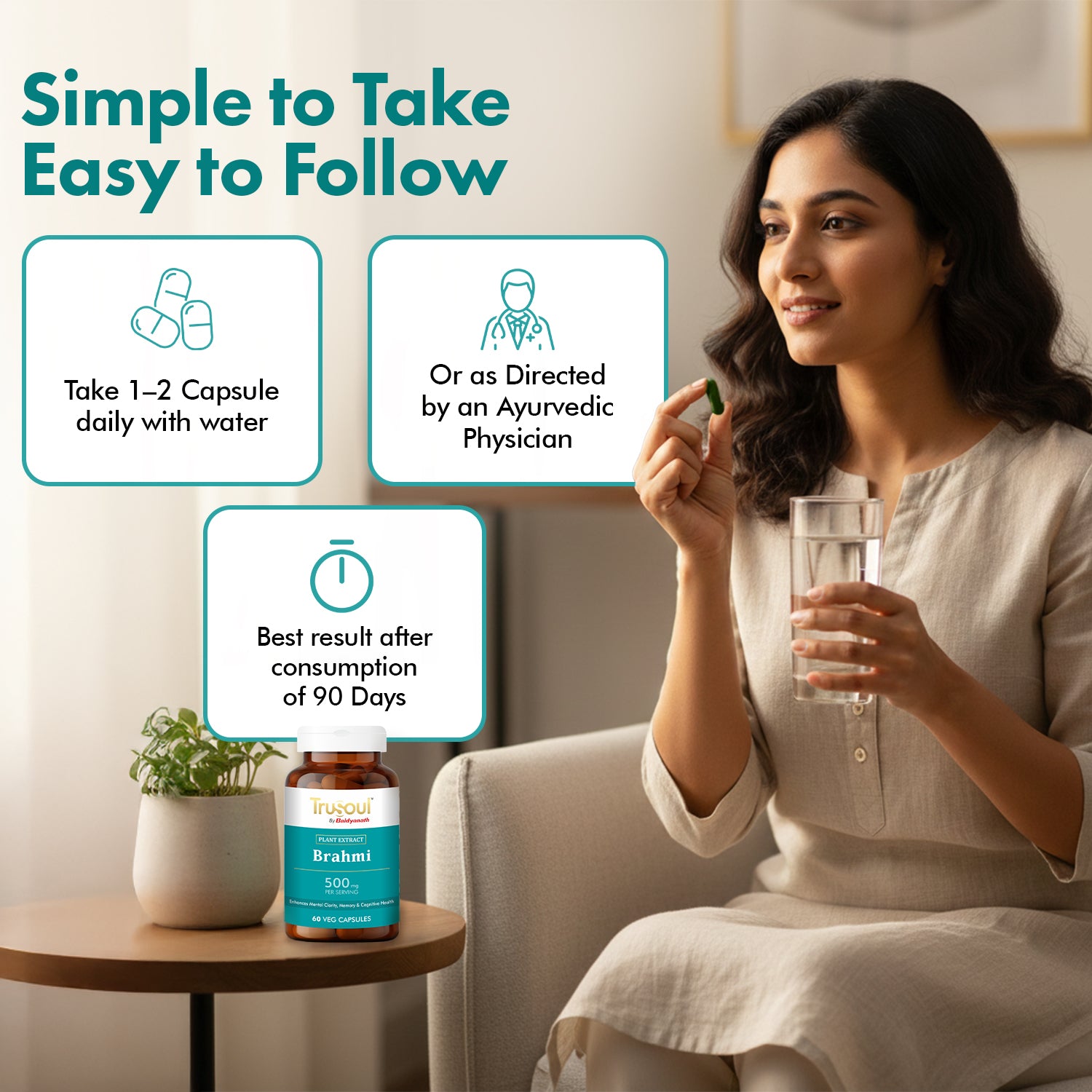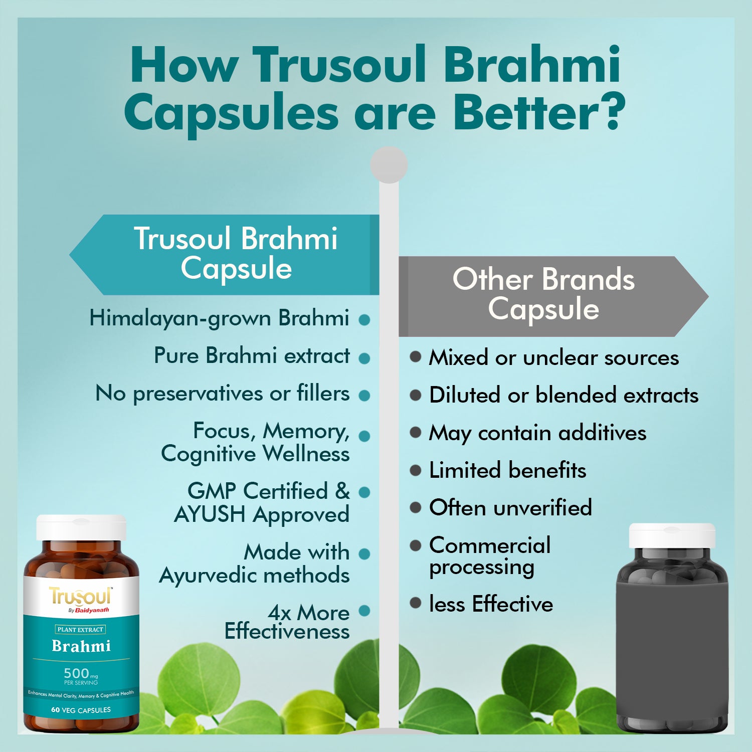 TruHerbs Brahmi Capsules are crafted to support your complete cognitive wellness naturally. Brahmi, also known as Bacopa monnieri, is one of Ayurveda’s most powerful herbs for the brain.